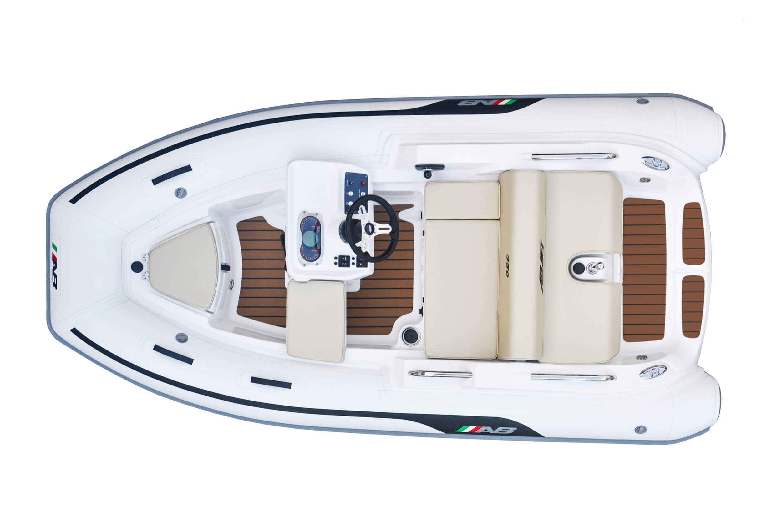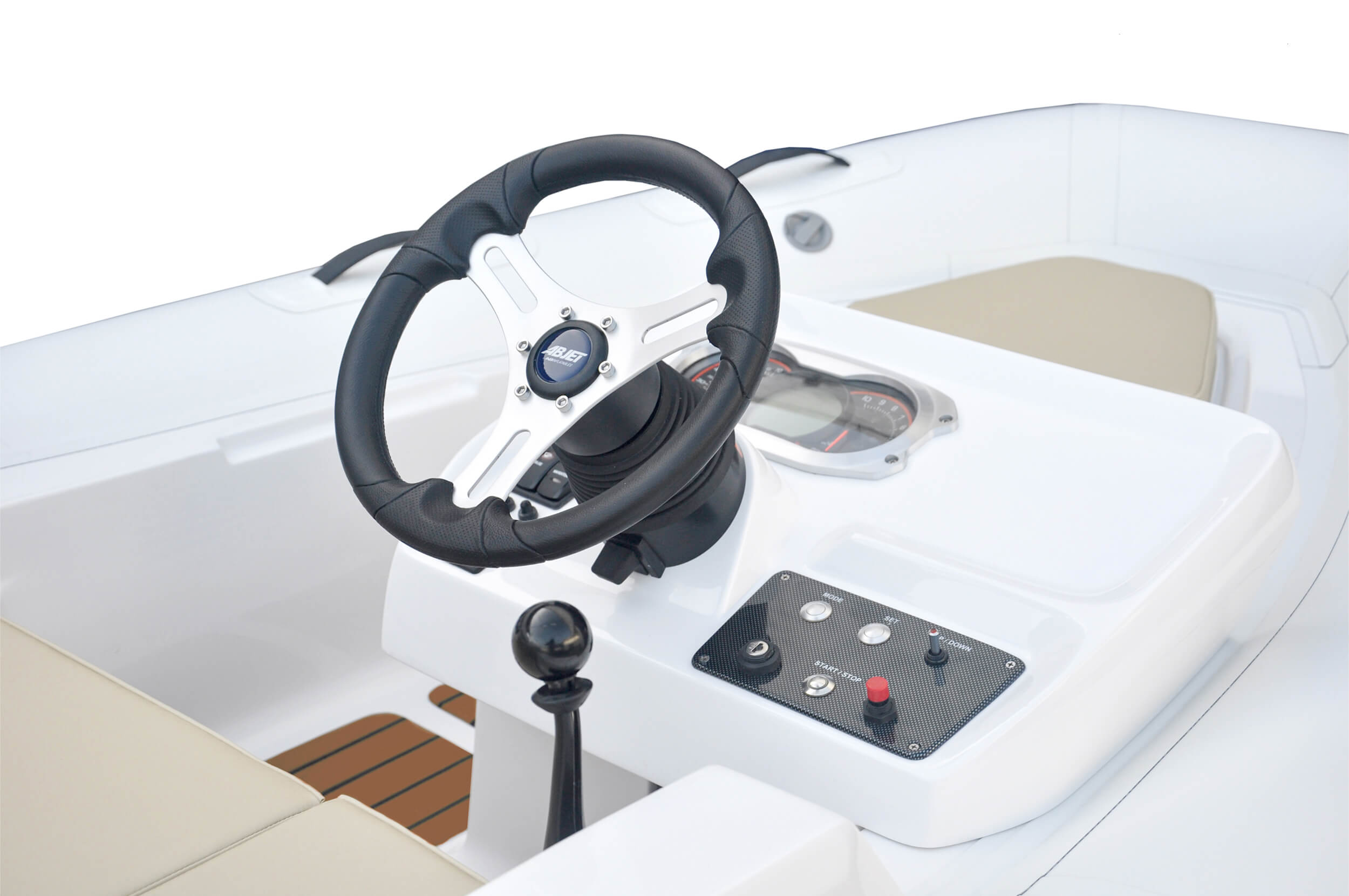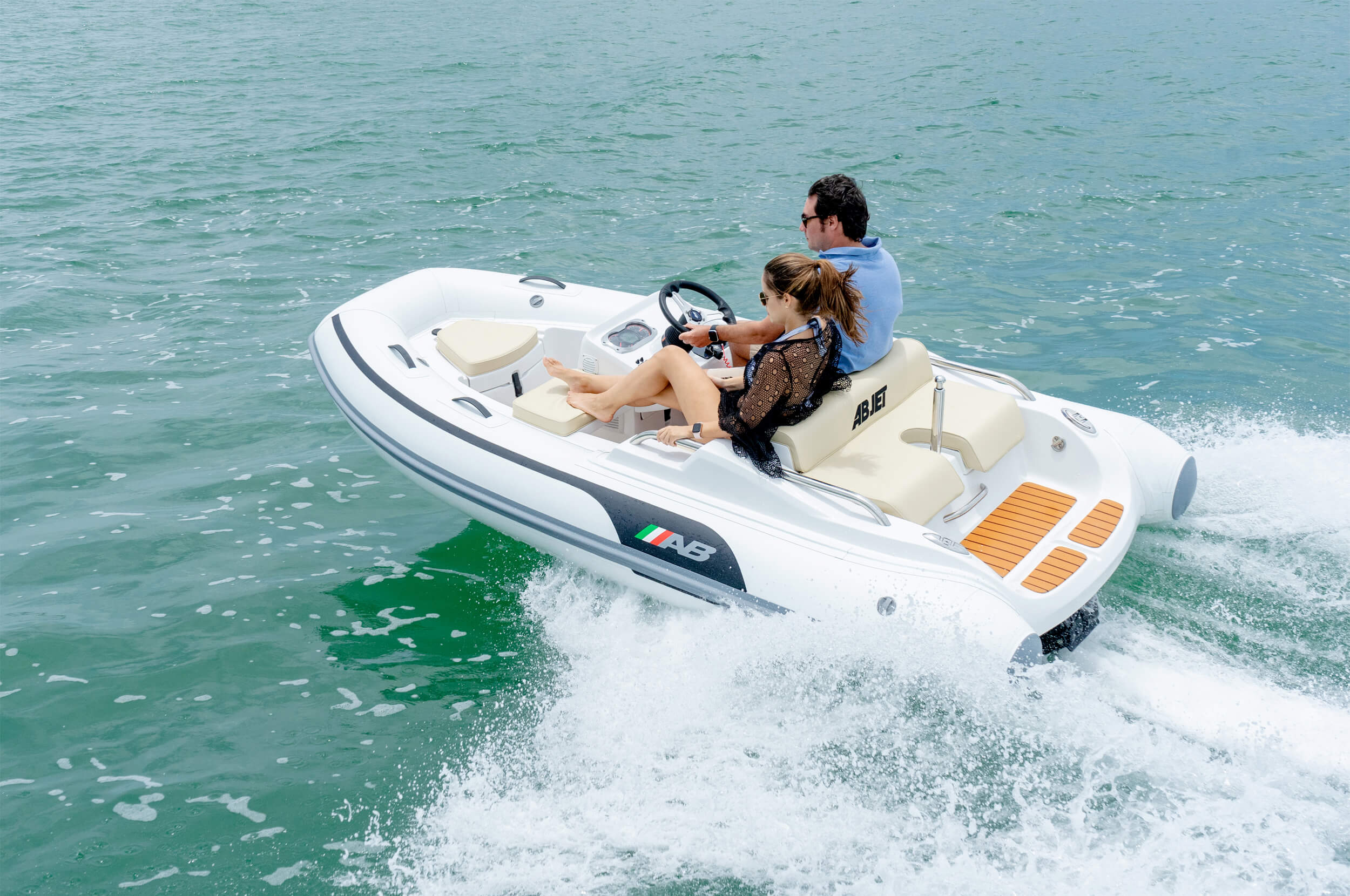 The ABJET® is designed to seat comfortably two people at the pilot’s seat and offer the best person capacity in the segment for better moments when enjoying the sea. With a flat floor deck free of obstacles, an ergonomically positioned throttle, a sport console with cupholders, a convenient platform with a stainless-steel sliding ladder, stainless steel handles and rails and, many other accessories of the highest quality, the ABJET® guarantees a seamless experience on the water. It also comes with a wide-range of customizable options to match the mother vessel.